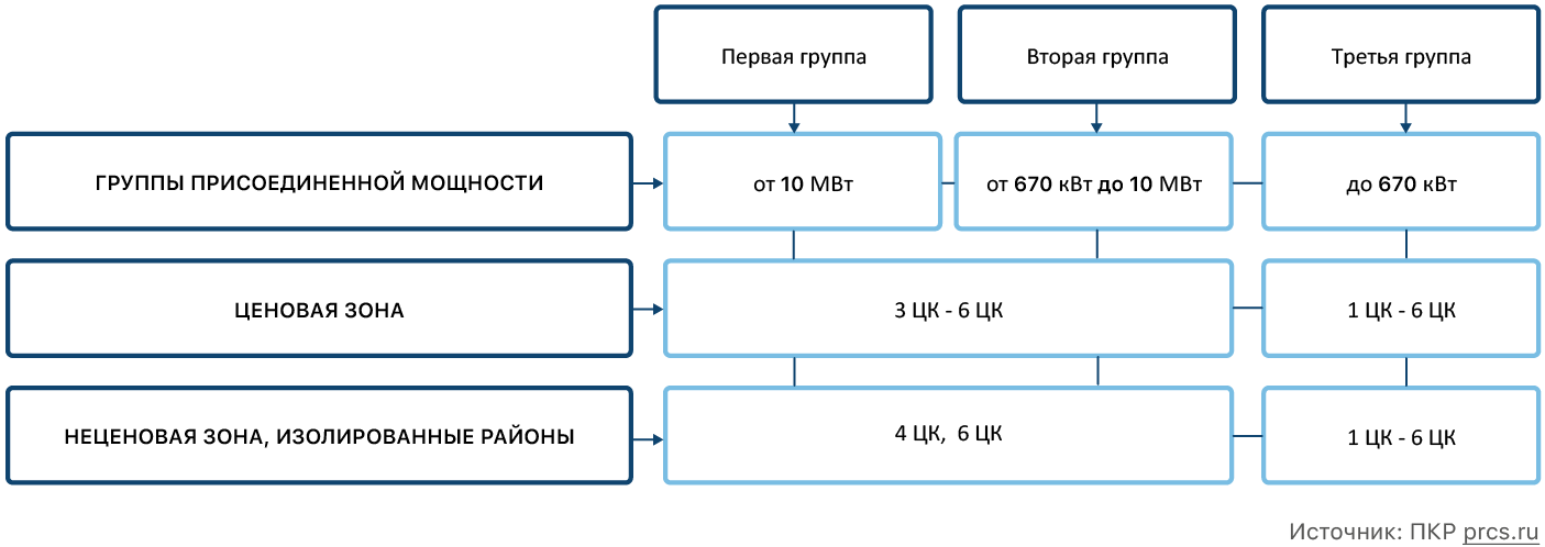 Существует 3 группы потребителей в зависимости от максимальной присоединенной мощности: