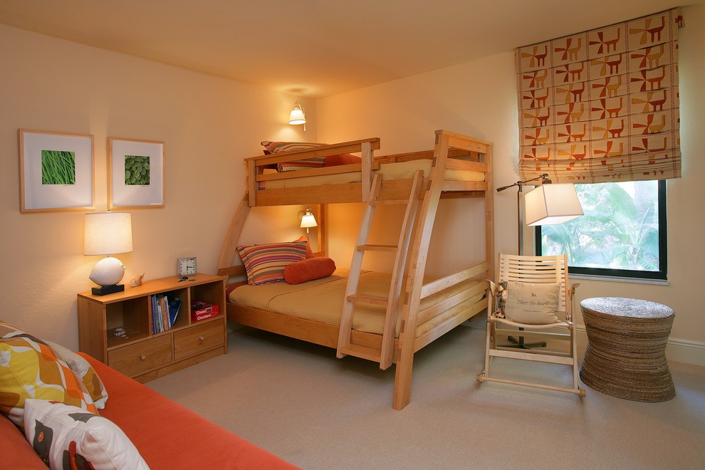 Детям постарше подойдут настольные лампы, расположенные рядом с изголовьем кровати