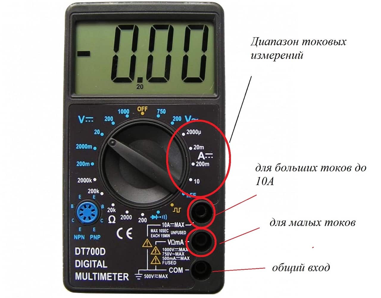 Розетка мультиметра с надписью COM является общей для всех видов измерений. Розетки, обозначенные mA и 10А предназначены только для подключения щупа при измерении силы тока. При измеряемом токе менее 200 мA штекер щупа вставляется в розетку mA, а при токе величиной до 10 А в розетку 10А.