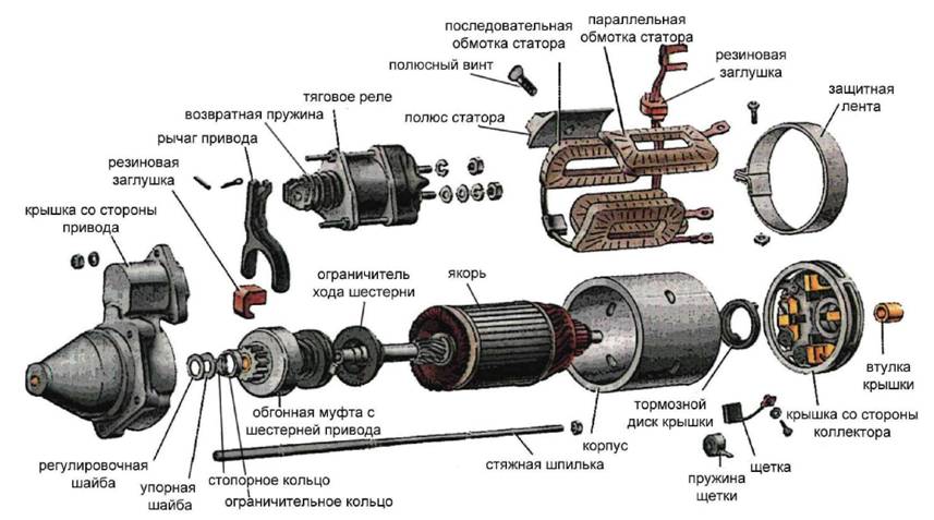 Стартер автомобиля работает как пусковое устройство двигателя. Он включается на время заводки мотора. Временная передача стартового усилия на коленвал двигателя обеспечивается втягивающим электромагнитом.