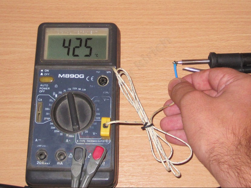 При пайке различных мелких радиодеталей, согласно требованиям различных нормативных документов, рекомендациям изготовителей электронных компонентов, технике безопасности, температура жала при его прикосновении к рабочей поверхности должна быть не выше 2700С. При работе с описываемым паяльным оборудованием данный показатель устанавливают при помощи регулировочных энкодеров на электронном блоке устройства. Проверяют правильность такой настройки, прикасаясь к жалу прибора кончиком термопары, подключенной к мультиметру.
