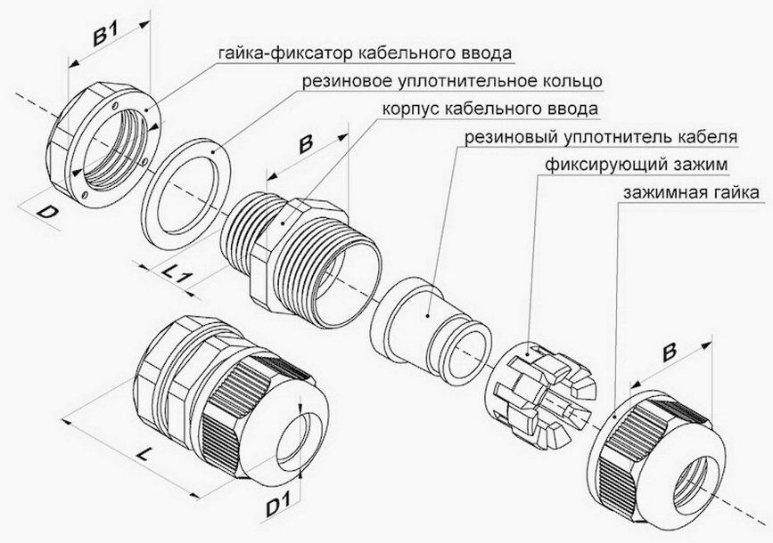 Самая распространенная и надежная конструкция гермоввода включает в себя следующие составные части: