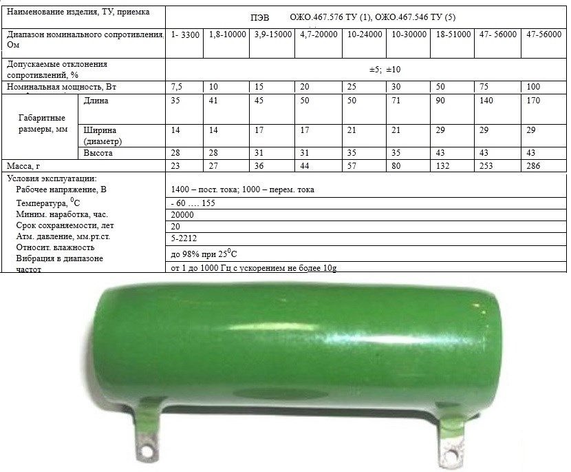 Таблица технических параметров серийных резисторов ПЭВ