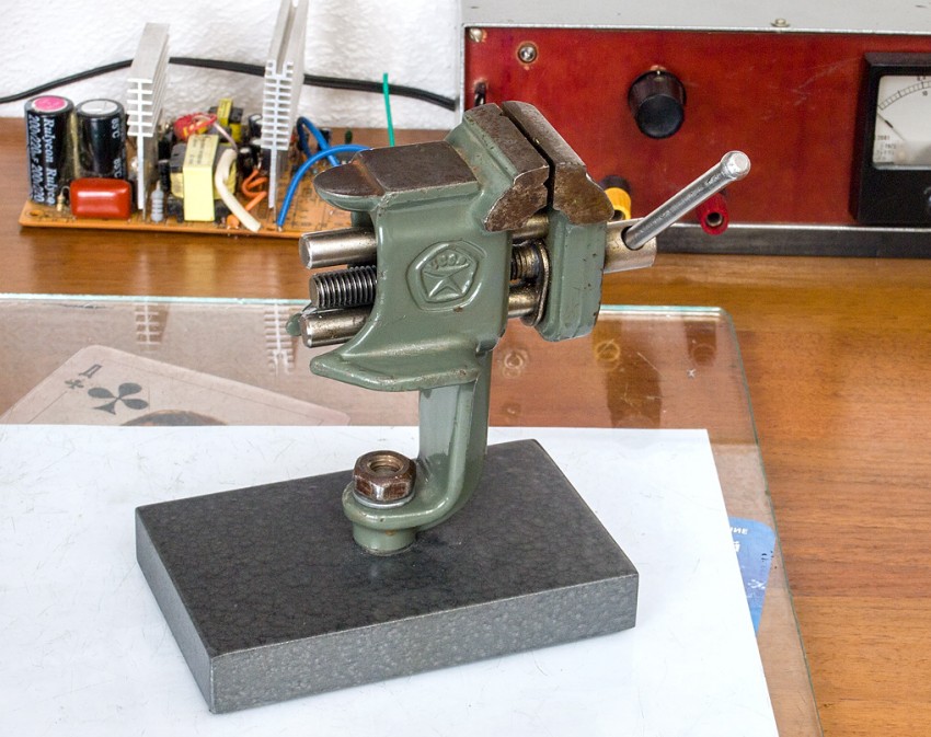 Сверлить отверстия небольшого диаметра можно на маленьком станке, изготовленном из остова старого микроскопа, на который установлен электродвигатель от магнитофона. Он гарантированно справится с тонким листовым материалом. Единственная трудность в изготовлении подобного устройства – сложно подобрать подходящий патрон.