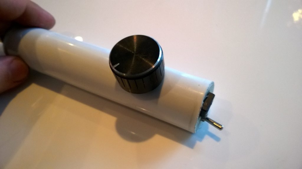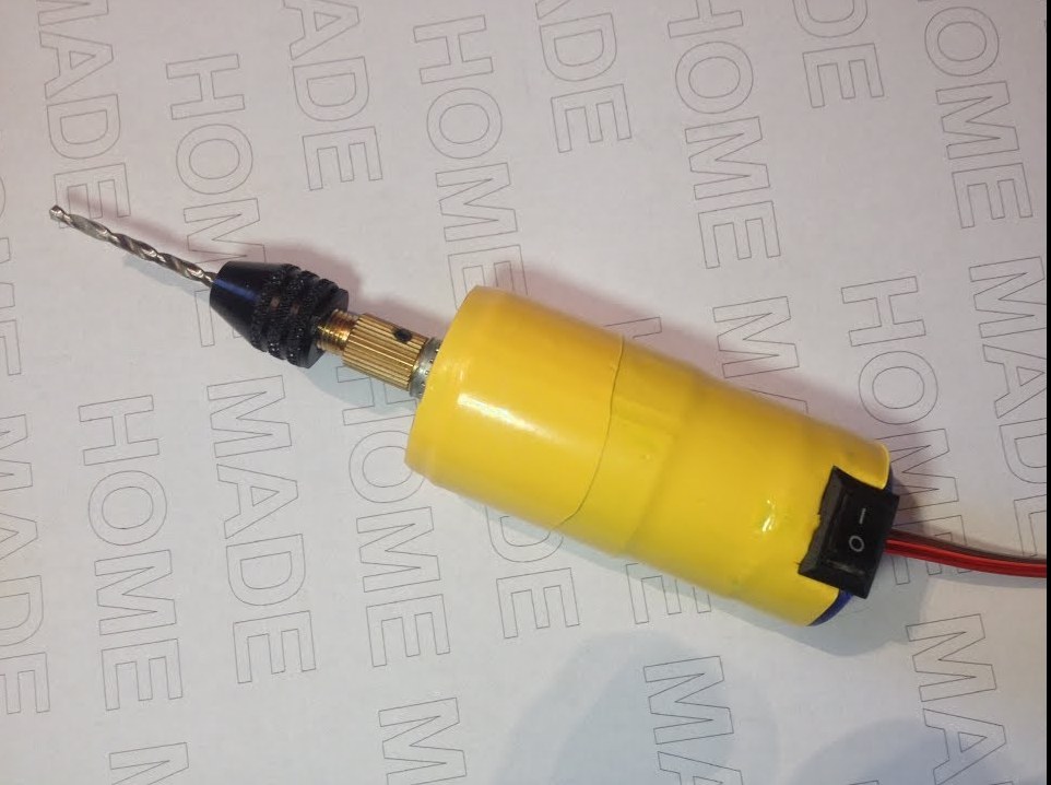 С помощью двух припаянных проводков силовой блок (через кнопку-переключатель или без него) прикрепляется к моторчику и фиксируется скотчем или клеем в самодельном трубкообразном корпусе. После этого на вал закрепляется все тот же цанговый патрон, который удерживает сверло.