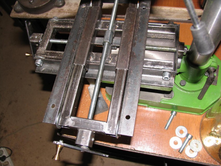 Полноценный сверлильный станок можно сделать из отслужившей свое рулевой рейки автомобиля. По ее размерам изготавливают станину, на которой крепят электродвигатель. Отлично подойдет двигатель от старой стиральной машины. Передача вращения осуществляется с помощью ременной передачи. Лучше использовать шкив с несколькими ручьями, это позволит регулировать скорость, тем самым работать с материалом разной твердости. По такой же схеме делают своими руками присадочные станки.