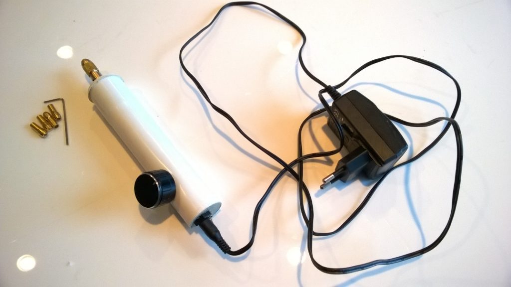 Чтобы инструмент мог использовать энергию бытовой сети, нужен выпрямитель с регулятором напряжения. Также понадобятся микровыключатель, электрошнур, паяльник. Обязательно наличие клеевого термопистолета. Для жёсткой фиксации деталей вместо него применяют композитный состав – холодная сварка.