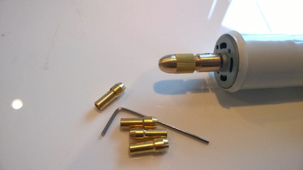 Если вы будете сверлить только текстолит печатных плат – смена сверла не потребуется. Значит крепим его стационарно. Переходную втулку можно сделать из чего угодно: трубка от телескопической антенны, игла от медицинского шприца, стержень от гелевой авторучки.