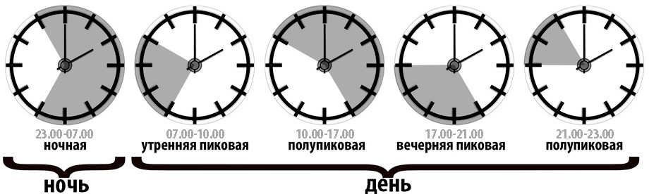 В каждом регионе существуют свои зоны, но суть их общая и заключается в разбитии суток на определённые зоны по загруженности сети потребителями. Существует три типа зон: