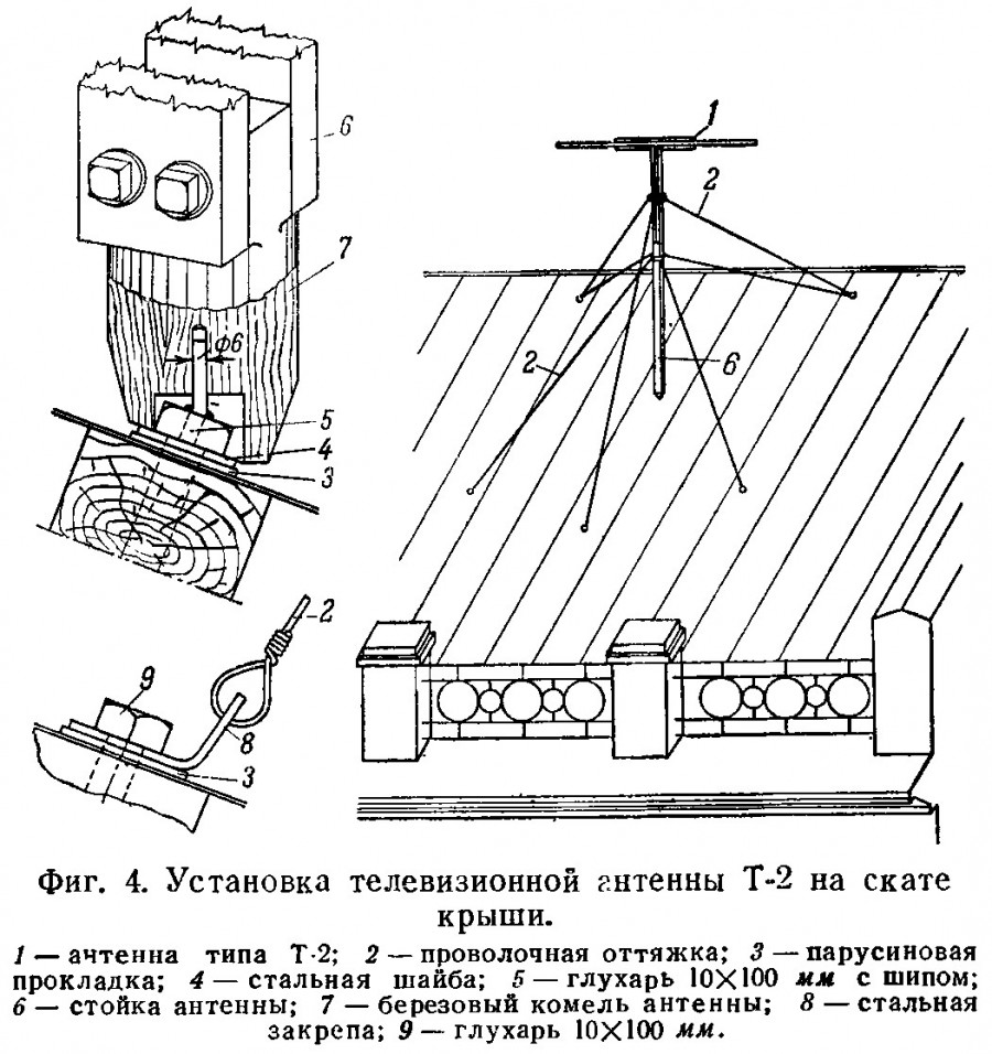 Крепеж лучше всего осуществлять с помощью хомутов с подпятником; вращая мачту, находят наилучшее изображение на экране телевизора, затем затягивают хомуты. Нельзя крепить антенну к слуховым окнам, телефонным стойкам или дымовым трубам. Не рекомендуется установка мачты на дереве, которое, раскачиваясь при сильном ветре, может дать дополнительные помехи.