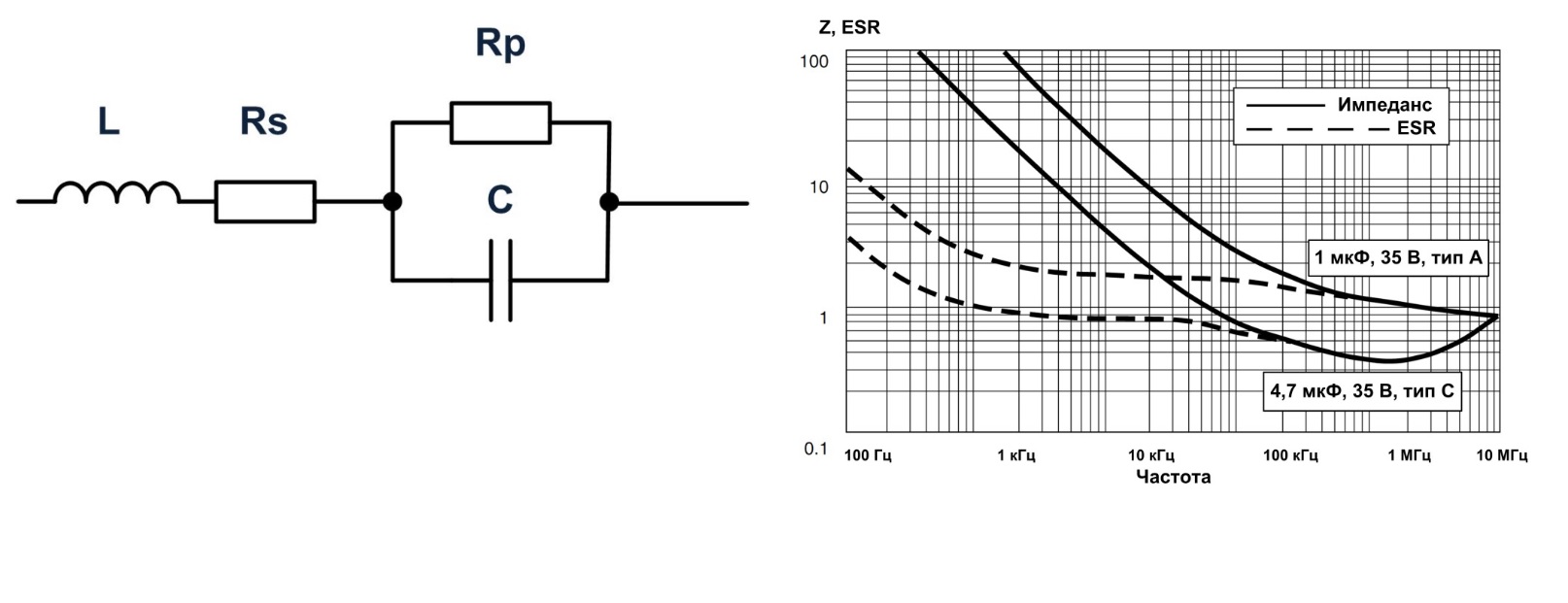 Полное сопротивление (импеданс) зависит от частоты. По графику видно, как быстро уменьшается сопротивление в диапазоне 1-100 кГц. Эквивалентное последовательное сопротивление обозначают стандартной аббревиатурой ESR.