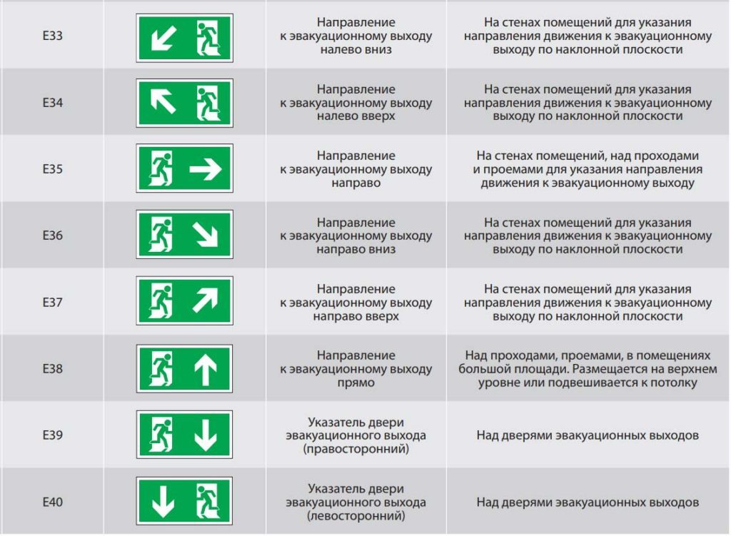 Эти знаки не имеют такого уровня освещенности, как светильники, но они играют роль дорожных указателей (как и куда двигаться людям), и при этом подсвечивающего эффекта вполне достаточно. Иногда знаки подсвечиваются не самостоятельно, а расположены так, чтобы их освещали аварийные лампы. Главное при этом — наглядность и видимость ведущих стрелок.
