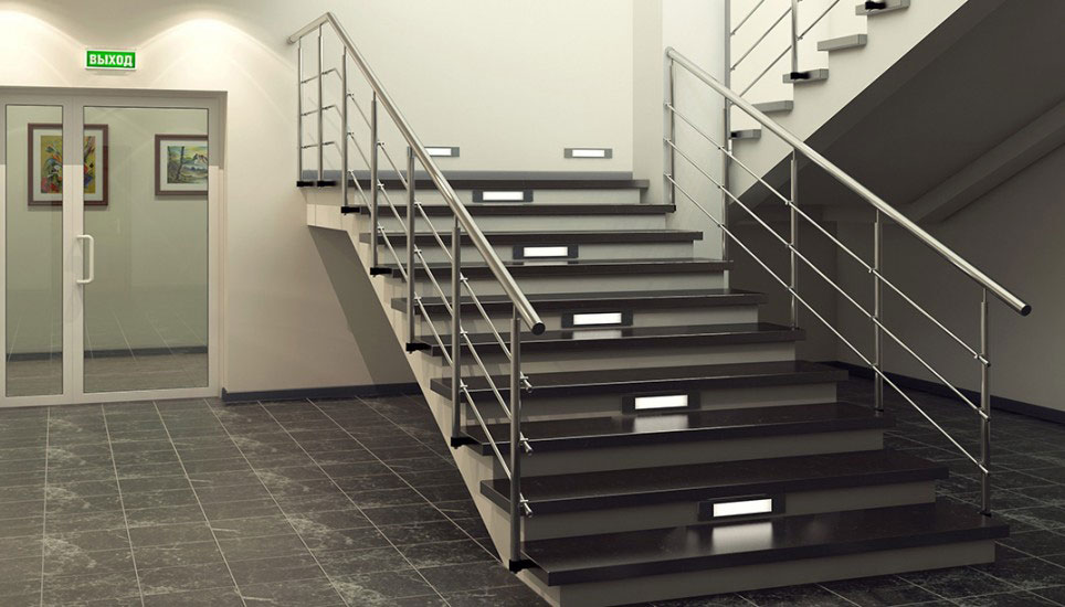 - В соответствии с таблицей, указанной в этом документе, всё освещение нормируется исходя из его классификации, то есть люминесцентное (дневного света) или с помощью, уже немного устаревших, ламп накаливания. Наименьшая освещённость на лестничных клетках в подъездах и поэтажных коридорах должна быть не ниже 10 Лк при освещении люминесцентными источниками света, и не меньше 5 при освещении лампами накаливания. Данные системы освещения должны освещать площадки, ступеньки лестниц, пол коридоров. Если освещение лестничных клеток осуществляется в комплексе, то есть этими двумя типами светильников, то расчёт минимальной освещённости должен быть рассчитан по люминесцентному типу, а это значит не меньше 10 Лк.