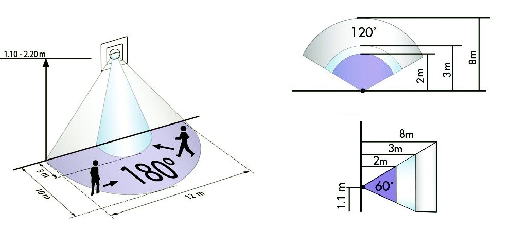 Ширина угла действия у настенных датчиков варьируется от 120 до 280 градусов. Для потолочных устройств показатель доходит до 360, что позволяет отслеживать движение во всей комнате. Значение нужно выбирать исходя из места установки.