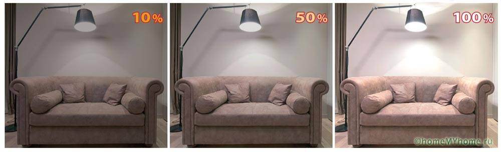 Диммер — экономически выгодное устройство — в нужное время он уменьшает освещение до 10-50%, а количество потребляемой электроэнергии уменьшается и время работы ламп накаливания соответственно увеличивается. Кроме того, таким плавным регулятором можно управлять сразу несколькими группами ламп.