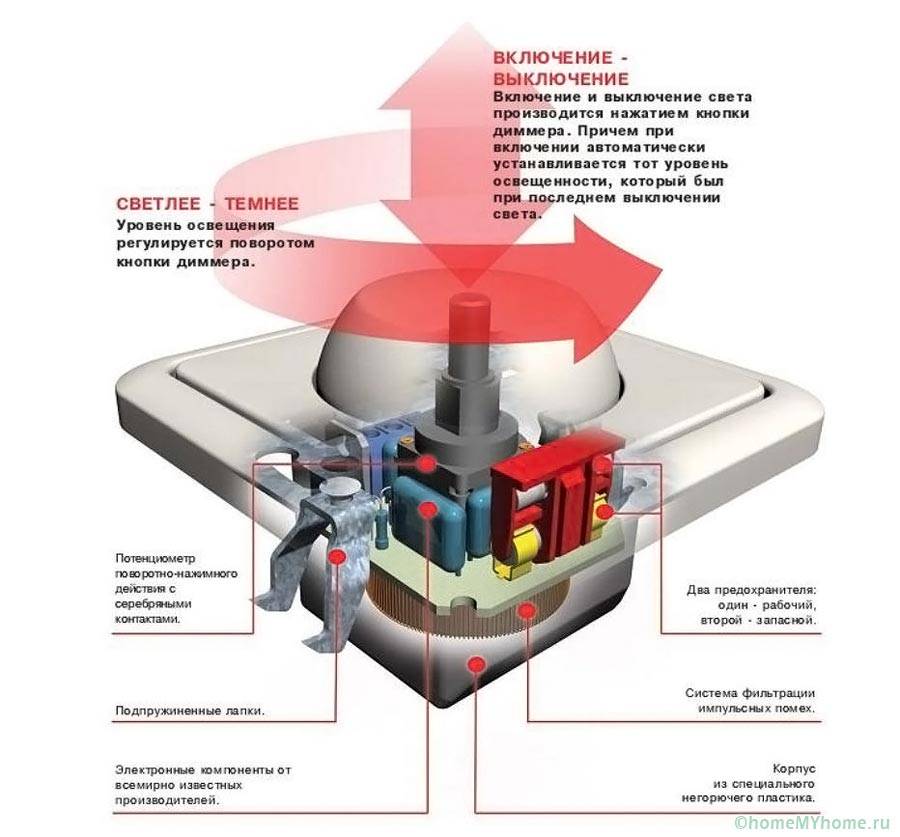 Конструкция диммера включает в себя размеренную регулировку сопротивления выключателя, в действие которую приводит поворотный кулачок, электронное устройство в виде пульта ДУ или датчика движения или сенсорный механизм.