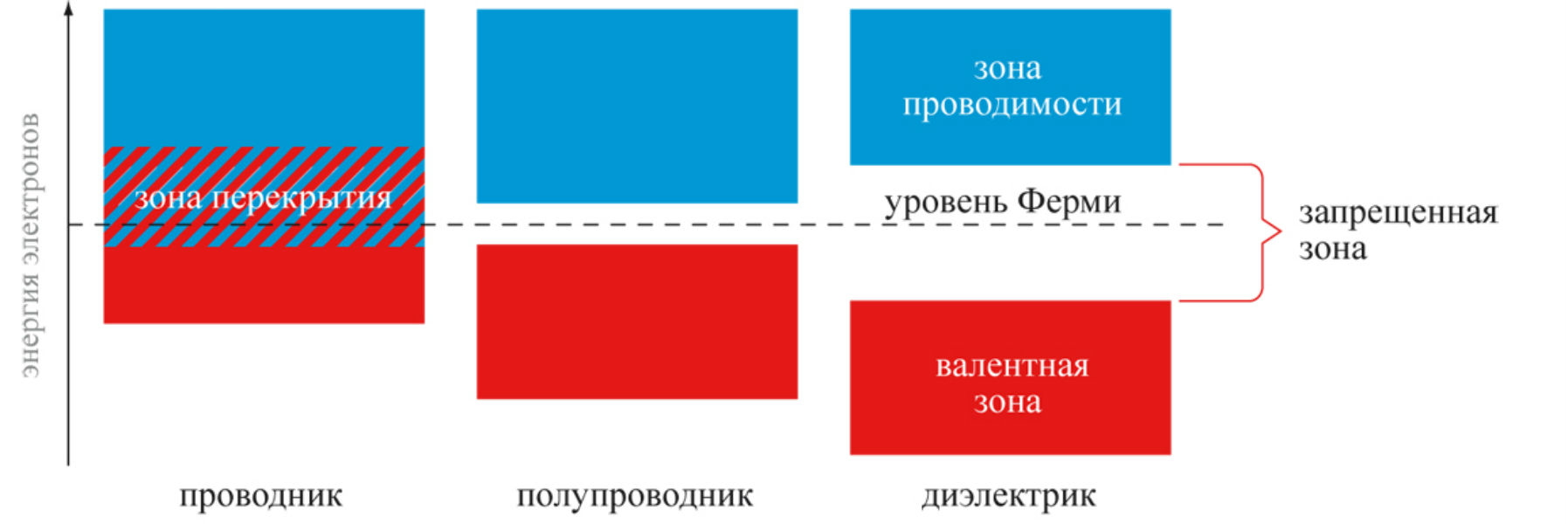 Все вещества характеризуются энергетическими зонами электронов оболочки атома. Таких зон три: