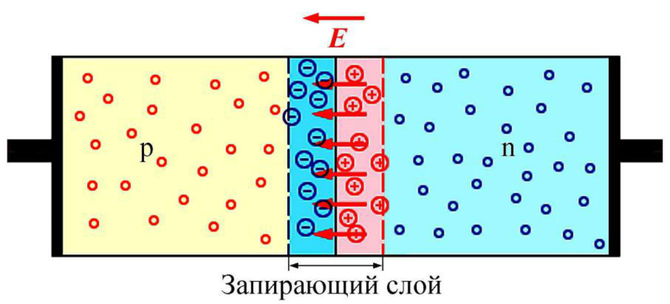В результате физических процессов движения электронов и дырок на границе веществ возникает электрическое поле, и образуется так называемый p-n переход.