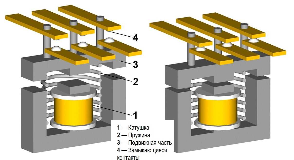 Электромагнитное устройство имеет в себе дроссели с сердечниками, соединенными с замыкательными контактами. На последних лежит бинарная операция закрывания-открывания токопропускающей цепочки. Схема действия выглядит так: когда на дроссель идет напряжение, благодаря появляющемуся импульсу, движущийся компонент сердечника перемещается по направлению к статичному, и цепь замыкается. В ней появляется электроток, и оборудование начинает работу. При прекращении поступления энергии сердечник пружиной перенаправляется в исходную позицию. Тогда цепь размыкается, а техника выключается. На катушку устройства питание идет с управляющей цепи (не более 230 В), а замыкание контактов относится к силовой, несущей большую нагрузку.