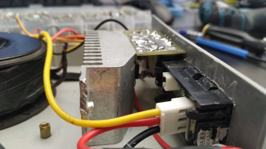 Транзистор и микросхему я установил на радиатор через изолирующие прокладки. Радиатор выбрал максимально большой из имеющихся и подходящий под мой корпус. Закрепил его двумя болтами к нижней крышке корпуса.