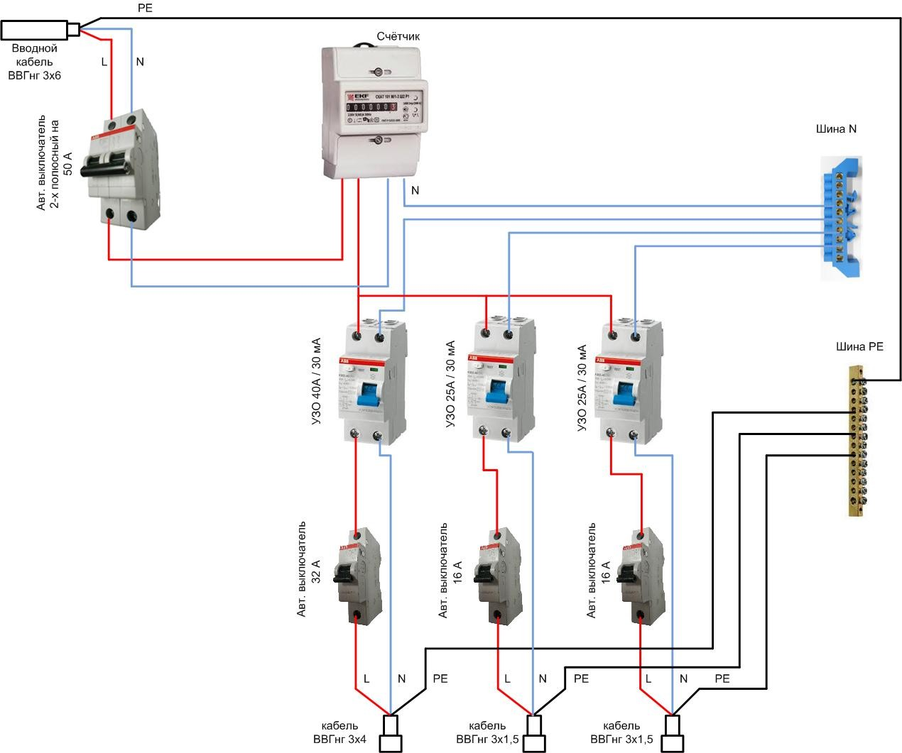 - Рекомендуется, чтобы в схеме был учтен прибор УЗО или дифференциальный автомат. Словом, требуется защита от утечек тока.