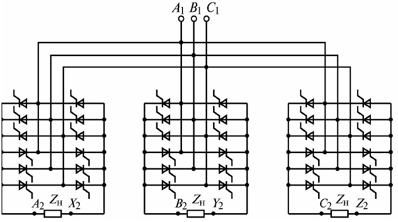 При использовании НПЧ напряжение из сети подается через управляемые вентили на двигатель. В каждой фазе НПЧ установлен реверсивный двухкомплектный преобразователь с совместным или раздельным управлением силовыми комплектами.
