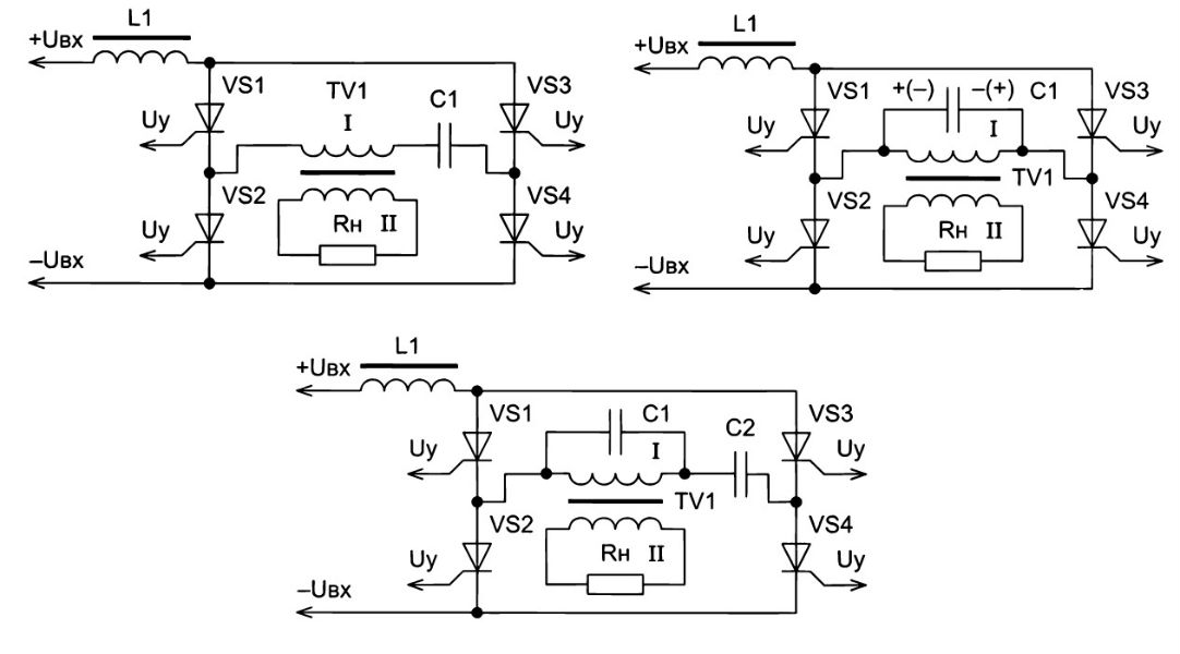 Данный тип преобразователей имеет дополнительный конденсатор, включенный последовательно или параллельно нагрузке. Назначение конденсатора – обеспечение надежного запирания тиристоров, не участвующих в прохождении тока по силовой цепи. Для стабилизации тока через нагрузку вход инвертора тока содержит индуктивность, которая в идеальном случае должна стремиться к бесконечности.