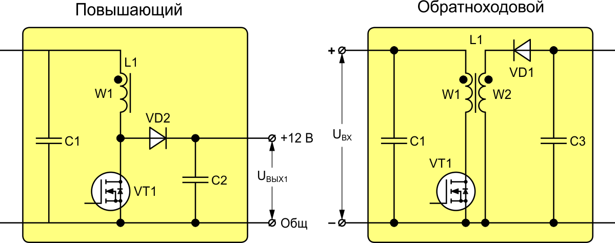 Наша схема, на первый взгляд, не является ни одной из «базовых», однако посмотрим на нее внимательно. Если мысленно убрать из нее все элементы, относящиеся ко второму каналу преобразования (обмотку W2, VD1, C3), то останется классический повышающий преобразователь, а если убрать элементы первого канала (VD2, C2) – то обратноходовой (Рисунок 3).