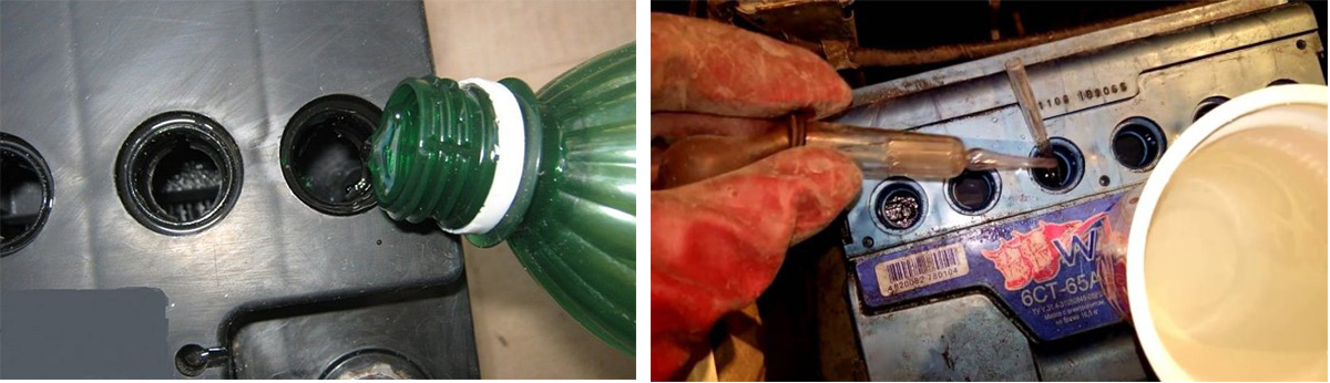 - зарядка слабым током, используя дистиллированную воду вместо электролита.
