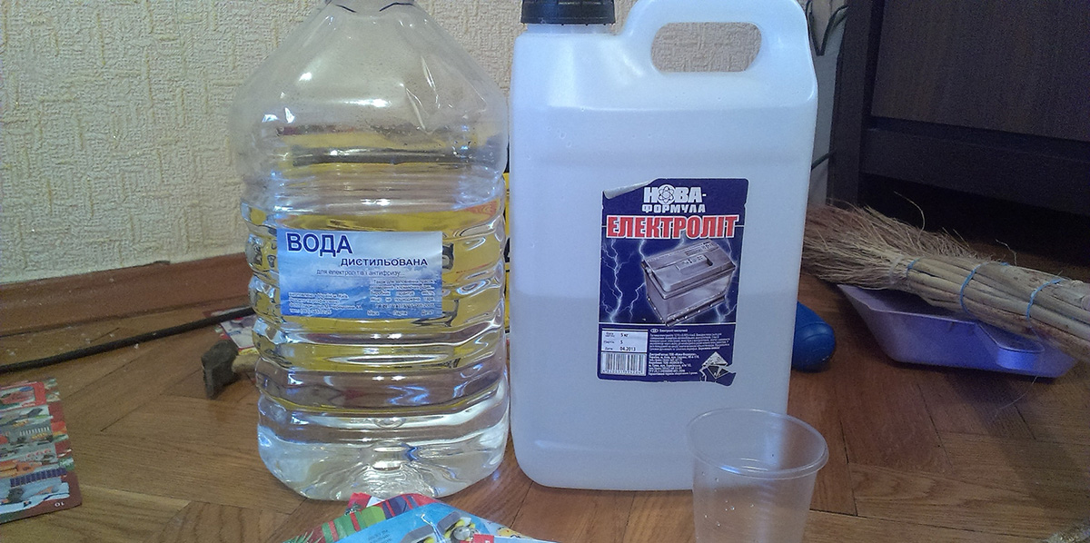 Дистиллированная вода и электролит для восстановления аккумулятора.