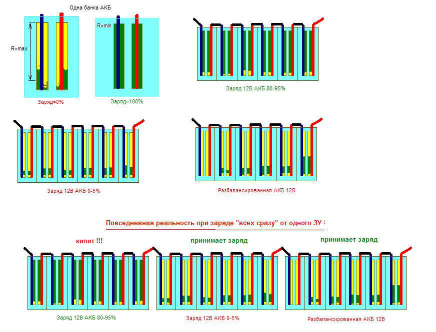 Аккумулятор состоит из отдельных емкостей, которые раньше в просторечии именовали банками. Все они соединяются последовательно и дают суммарное напряжение 12,6 (у хорошего АКБ), которое обеспечивает нормальное функционирование бортовой сети авто (). В случае если в одной из них емкость значительно понизилась (ее именуют «отстающей»), вплоть до нуля по сравнению с остальными, при прохождения зарядного тока (от ЗУ или генератора) полюса «меняются» местами. Это приводит к цепной реакции, инициирующей выход из строя соседних двух-трех банок. Решение лишь одно – попробовать привести неисправную емкость в нормальное состояние, то есть восстановить.